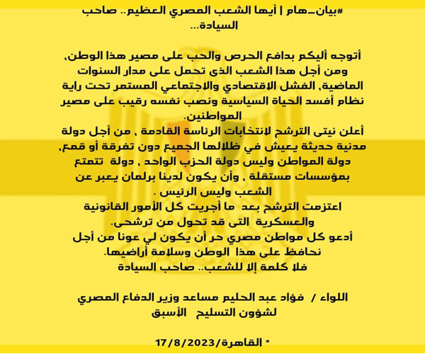 البيان الذي صدر عن حساب بمواقع التواصل يزعم أنه تابع للمكتب الإعلامي لـ اللواء فؤاد عبد الحليم، أعلن عن ترشح القيادي العسكري السابق بالقوات المسلحة لانتخابات الرئاسة المرتقبة.