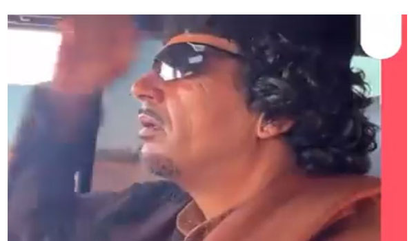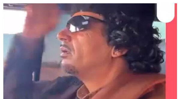 وظهر شبيه القذافي بشعره الكث ونظارته السوداء الشهيرة، داخل سيارة بدت عسكرية وهو يرفع قبضة يده اليمنى على طريقة القذافي، فيما شوهد سيارات مرافقة تحمل العلم الليبي.