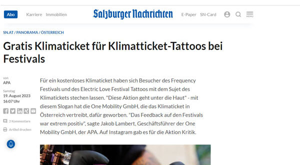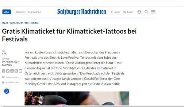 وأقامت مؤسسات نمساوية رسمية مراكز مؤقتة للوشم في مهرجان “الحب الكهربائي” في سالزبورغ ومهرجان “فريكونسي” في سانت بولتن، للترويج لعرض منح المقيمين فرصة ركوب وسائل النقل العام في أي مكان في البلاد مجانًا ولمدة عام، إذا قاموا بوضع وشم على أجسادهم مكتوب عليه “Klimaticketوهو ” اسم بطاقة نقل سنوية تم إطلاقها مؤخرًا وتقوم بنفس الغرض.”