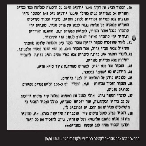 كما قدم تفاصيل عن الضربات الجوية المتوقعة من قبل جيوش مصر وسوريا: “سوف تهاجم القوات الجوية المصرية أهدافًا في سيناء. ولن تهاجم في عمق إسرائيل. وستهاجم القوات الجوية السورية ثلاث قواعد عسكرية، إحداها في رمات ديفيد، وسيحاولون ضرب المدارج”.