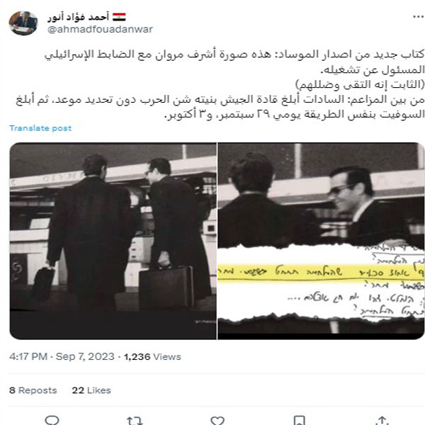 وقالت الصحيفة العبرية في تقريرها، إن أشرف مروان هو الذي نقل لرئيس الموساد السابق “زفي زامير”، التحذير من الهجوم المشترك لجيشي مصر وسوريا في الليلة التي سبقت اندلاع الحرب عام 1973.