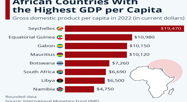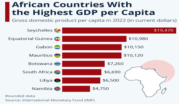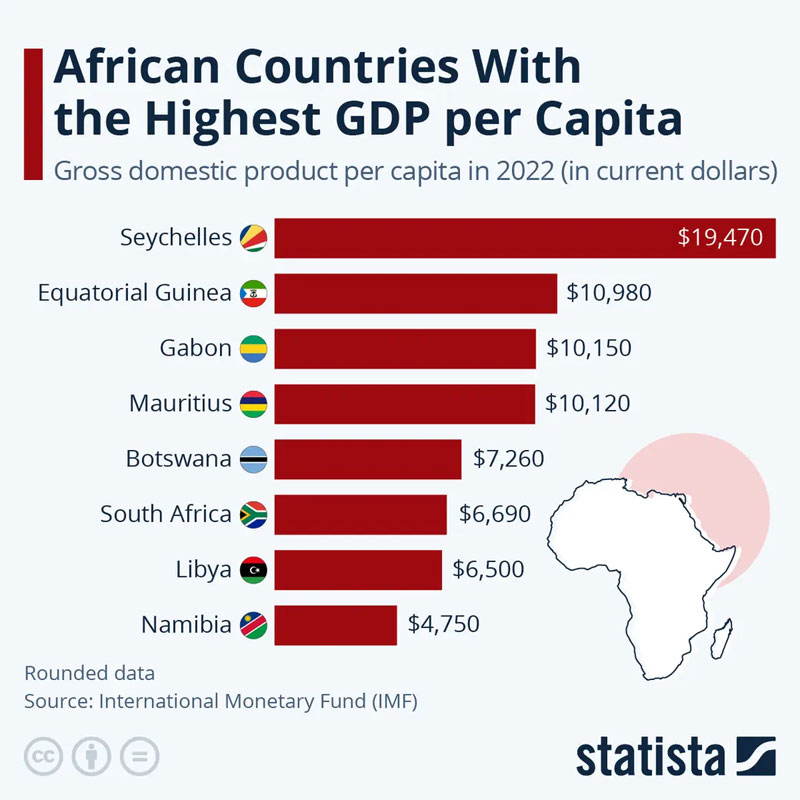 وتحتل جنوب إفريقيا، التي استضافت قمة البريكس السنوية الأسبوع الماضي، المركز السادس، حيث يبلغ نصيب الفرد من الناتج المحلي الإجمالي حوالي 6700 دولار في عام 2022، خلف موريشيوس (10120 دولاراً) وبوتسوانا (7260 دولاراً).