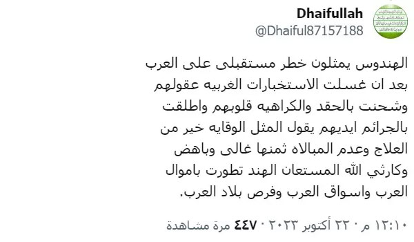 وكتب Dhaifullah: “الهندوس يمثلون خطر مستقبلى على العرب، بعد أن غسلت الاستخبارات الغربية عقولهم، وشحنت بالحقد والكراهية قلوبهم”.