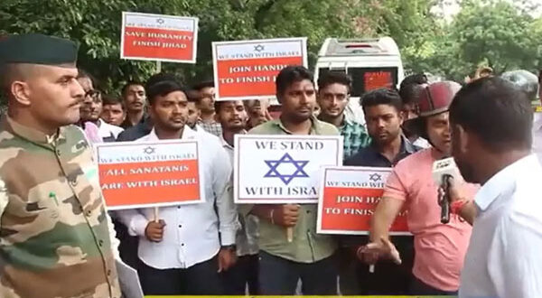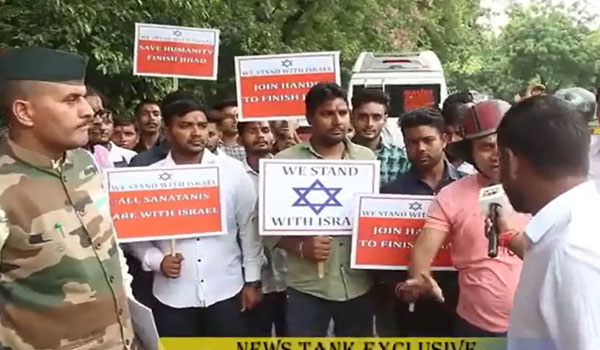 Hindu far-right supporters gathered in front of the Israeli embassy in New Delhi to offer voluntary services to go to Israel to fight against Palestinians.