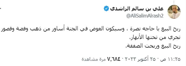وغرد علي بن سالم الراشدي عن خطوة السيدة عبر منصة إكس: “ربح البيع يا حاجة نصرة وسيكون العوض في الجنة أساور من ذهب وفضة وقصور تجري من تحتها الأنهار ربح البيع وربحت الصفقة”.