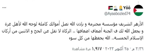وحول الجهة التي وصلتها التبرعات كتب مغرد آخر: “الأزهر الشريف مؤسسة محترمة و بإذن الله تصل أموالك كاملة لوجه الله لأهل غزة و يجعل الله لك في الجنة أضعاف أضعافها”.