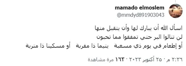 وذكر حساب آخر يحمل اسم “مامادو المسلم”: “اسأل الله أن يبارك لها وأن يتقبل منها .. لن تنالوا البر حتي تنفقوا مما تحبون.. أو إطعام في يوم ذي مسغبة يتيما ذا مقربة أو مسكينا ذا متربة”.