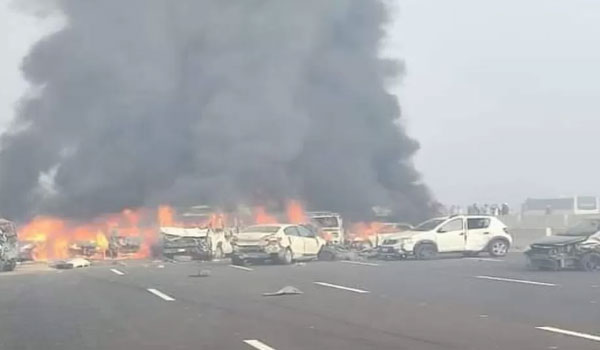 ووقع الحادث المروع بين حافلة وعشرات السيارات، فيما تكدست السيارات فوق بعضها وهي تحترق.