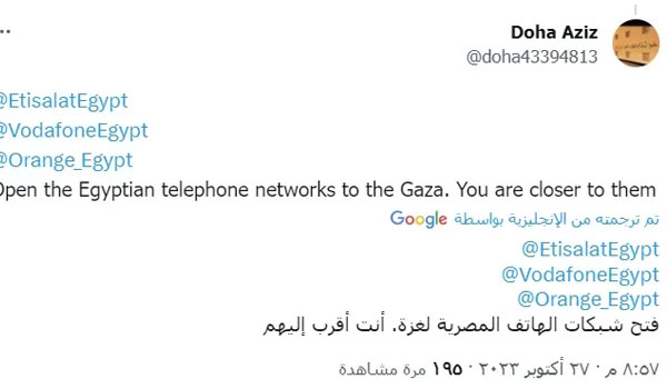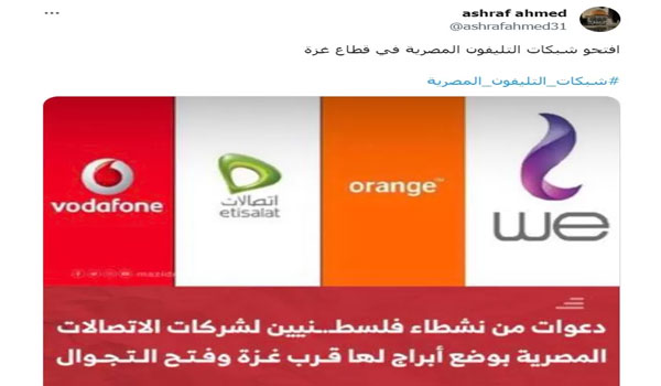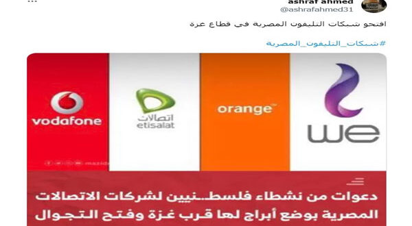 وقال أحد النشطاء عبر الوسم مطالبا بدعم أهالي غزة عبر فتح الشبكات المصرية لهم: “شركات الاتصالات المصرية عندها ابراج في رفح قريبة من غزة.. أقل حاجة نقدر نعملها نفتحلهم الشبكة علشان يقدروا يتواصلوا ويعرفوا العالم المجازر اللي بتحصل جوه.”