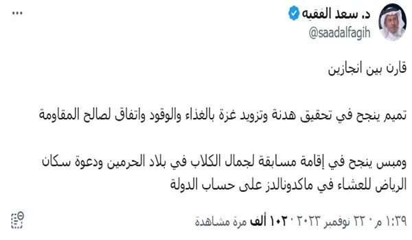 وعبر حسابه في منصة (إكس) غرد سعد الفقيه بسخرية من سياسات السعودية وكتب: “قارن بين انجازين .. تميم ينجح في تحقيق هدنة وتزويد غزة بالغذاء والوقود واتفاق لصالح المقاومة”.