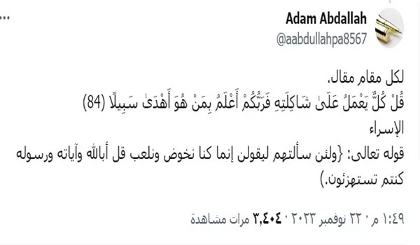وعلق آدم عبدالله بالآية القرآنية من سورة الإسراء: “كُلْ كُلٌّ يَعْمَلُ عَلَىٰ شَاكِلَتِهِ فَرَبُّكُمْ أَعْلَمُ بِمَنْ هُوَ أَهْدَىٰ سَبِيلًا (84)”.