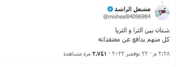 وأراد الفقيه المقارنة بين الثريا والثرا حسب وصف “مشعل الراشد” الذي أكد أن كل من النظام السعودي أو القطري يدافع عن معتقداته” حسب تعليقه على تغريدة المعارض السعودي