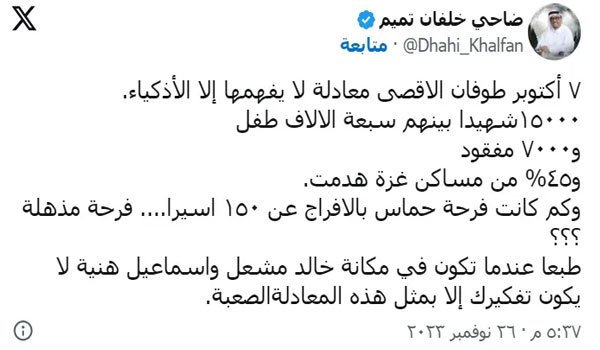 وكتب خلفان محاولاً تشويه صورة النصر الذي حققته غزة وأبناؤها: “٧ أكتوبر طوفان الأقصى معادلة لا يفهمها إلا الأذكياء ١٥٠٠٠شهيدا بينهم سبعة الالاف طفل و٧٠٠٠ مفقود و٤٥% من مساكن غزة هدمت”.