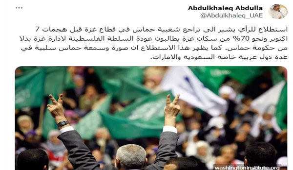 وزعم عبدالله في تغريدته وجود “استطلاع للرأي يشير الى تراجع شعبية حماس في قطاع غزة قبل هجمات 7 اكتوبر ونحو 70% من سكان غزة يطالبون عودة السلطة الفلسطينة لإدارة غزة بدلاً من حكومة حماس”.