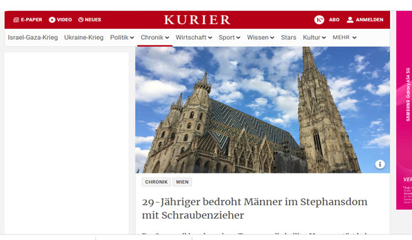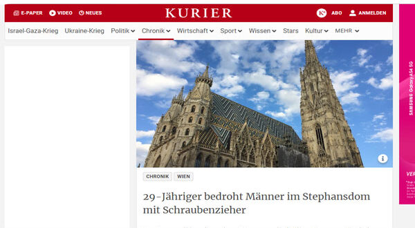 ذكرت الصحف النمساوية الصادرة اليوم الثلاثاء الموافق 28 من نوفمبر 2023 أنه تم إلقاء القبض على لاجئ سوري بالقرب من كنيسة إشتيفانز دوم الواقعة بوسط العاصمة النمساوية فيينا بعد محاولته عرقلة القداس في يوم سابق، وتهديده لرجلين من الكهنة يبلغان من العمر 34 عاماً بأداة حادة عبارة عن مفك مسامير كان في يده ، مُلمِحًا لهم بإشارة الذبح، والاشتباه في تخطيطه لتنفيذ اعتداء ضد الكنيسة في فيينا