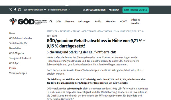 توصلت النقابة النمساوية للخدمات العامة (GÖD) إلى اتفاق مع الحكومة النمساوية لزيادة رواتب الموظفين الحكوميين أن الزيادة ستصل إلى حوالي 9,15٪، وأنها تأتي وفقًا لتوقعات التضخم ، اعتباراً من الأول من شهر يناير المقبل 2024.
