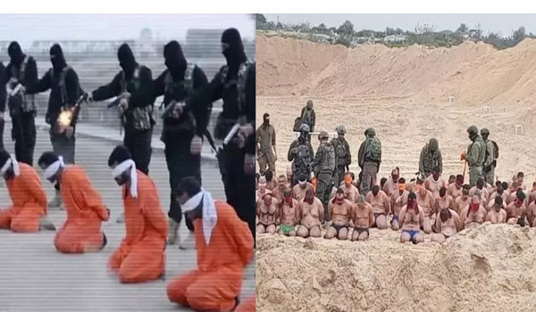 ونشر الرواد صورتين الأولى من غزة لما فعله جنود الاحتلال من إجرام وحشي بحق المعتقلين الذين جردتهم من ملابسهم في ظل الأجواء الشتوية الباردة وقامت بتعذيبهم، وأخرى سابقة للحظة إعدام عناصر تنظيم داعش لمعتقلين لديها، حيث تتشابه الصورتين.