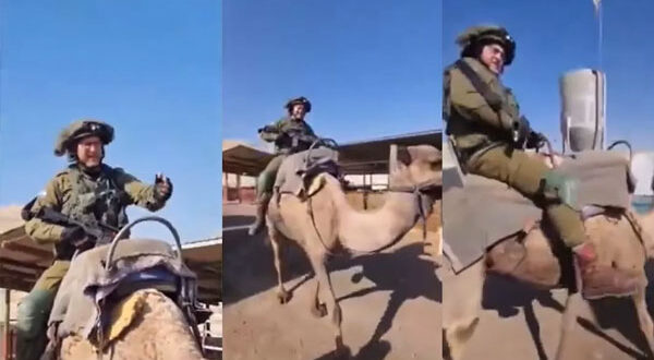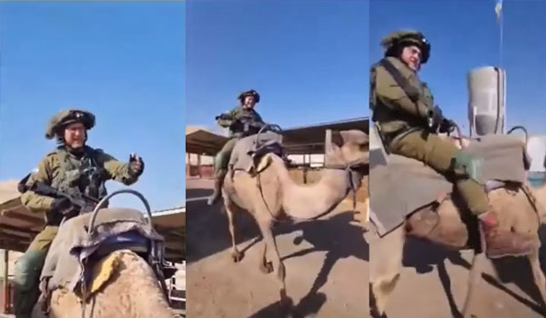 وتداول مستخدمو منصات التواصل مقطع فيديو لجندي إسرائيلي يسرق جمل مواطن فلسطيني بقطاع غزة، ويلتقط الصور وهو يركبه متفاخرًا وفرحا بفعلته.