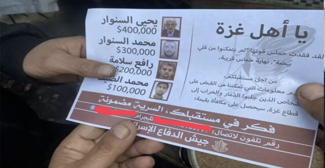 وطالب المنشور سكان القطاع بتقديم معلومات تمكن الاحتلال الإسرائيل من القبض على من زعمت الرسالة (كاذبة) بأنهم “جلبوا الدمار والخراب إلى قطاع غزة”.