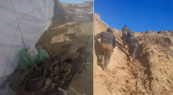 وأظهر الفيديو الذي رصدته “وطن” عدداً من مقاومي القسام وهم يرتقون جبلاً إلى أن يشرفوا على واد عميق، ويتم تحديد هدف في قمة الجبل بالمثلث الأحمر المقلوب.