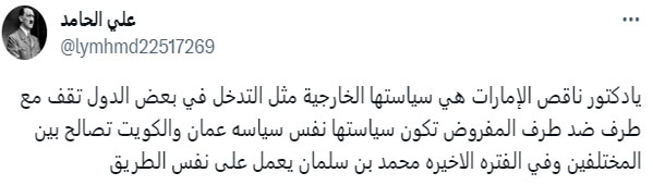 وكتب علي الحامد: “يادكتور ناقص الإمارات هي سياستها الخارجية مثل التدخل في بعض الدول تقف مع طرف ضد طرف المفروض تكون سياستها نفس سياسه عمان والكويت تصالح بين المختلفين وفي الفتره الاخيره محمد بن سلمان يعمل على نفس الطريق”.