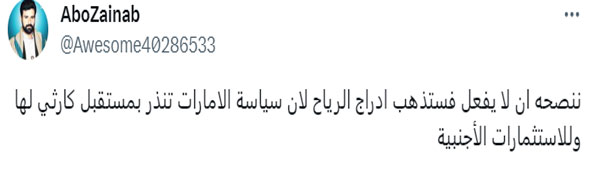 وغرد حساب يحمل اسم “أبو زينب”: “ننصحه ان لا يفعل فستذهب ادراج الرياح لان سياسة الامارات تنذر بمستقبل كارثي لها وللاستثمارات الأجنبية”.