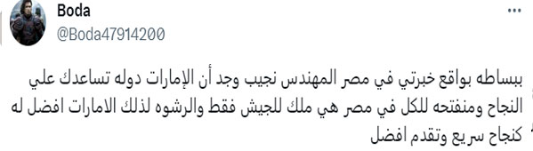 ومن التعليقات ما كتبه مغرد آخر يحمل اسم “بودا”: “ببساطه بواقع خبرتي في مصر المهندس نجيب وجد أن الإمارات دوله تساعدك علي النجاح ومنفتحه للكل في مصر هي ملك للجيش فقط والرشوه لذلك الامارات افضل له كنجاح سريع وتقدم افضل”.