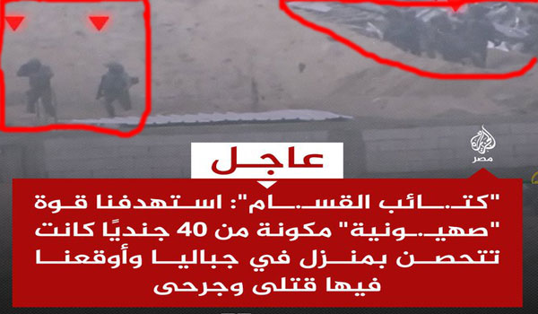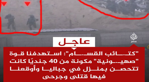 وذكرت الكتائب في بيانها بأن “المجاهدين تمكنوا من استهداف قوة صهيونية خاصة مكونة من فصيل معزز قوامه 40 جندي متحصنة في أحد المنازل في منطقة جباليا البلد شمال قطاع غزة”.