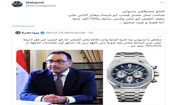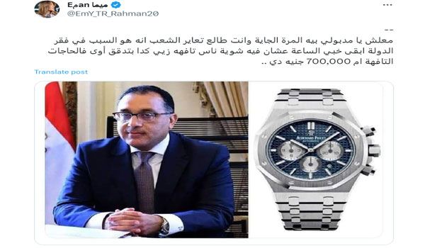 وكتب عن ذلك حساب يحمل اسم “إيمي رحمان” متندراً: “معلش يا مدبولي بيه المرة الجاية وانت طالع تعاير الشعب انه هو السبب في فقر الدولة ابقى خبي الساعة عشان فيه شوية ناس تافهه زيي كدا بتدقق أوى فالحاجات التافهة ام 700,000 جنيه دي”.