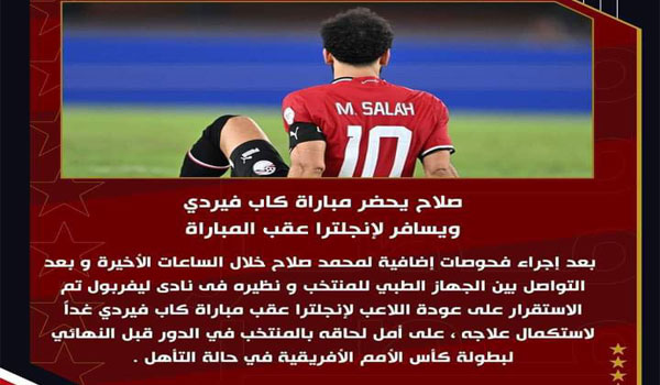 وأعلن الاتحاد المصري لكرة القدم في بيان رسمي نشره عبر حسابه على منصة (X)، بشأن إصابة محمد صلاح، ” بعد إجراء فحوصات إضافية لمحمد صلاح خلال الساعات الأخيرة، وبعد التواصل بين الجهاز الطبي للمنتخب ونظيره نادي ليفربول، تم الاستقرار على عودة اللاعب إلى إنجلترا”.