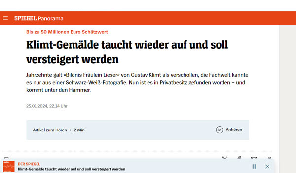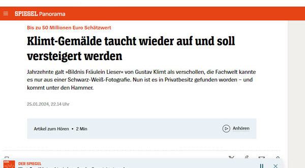 بعد فقدان أثرها لعشرات السنين، ظهرت لوحة غير واضحة المصدر، للرسّام النمساويّ الشهير غوستاف كليمت، ضمن مزاد سيطرح بتاريخ 24 نيسان/ أبريل المقبل.