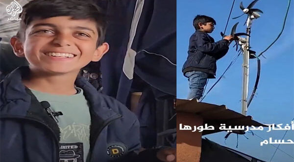 وقالت قناة “الجزيرة مباشر” في تقرير مصور لها إن الطفل “حسام العطار” نجح باختراع يولد التيار الكهربائي داخل خيمة نزوحه.