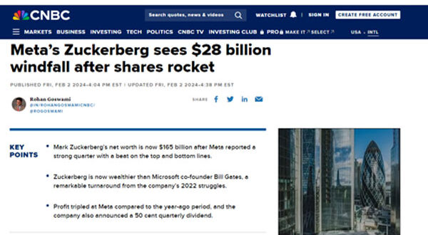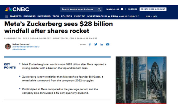 وبذلك يصبح زوكربيرغ الآن أكثر ثراءً من بيل جيتس، أحد مؤسسي شركة مايكروسوفت، وهو تحول ملحوظ عن صراعات الشركة في عام 2022.