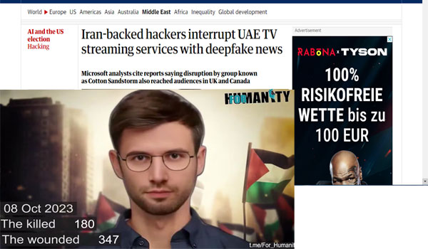 كشفت صحيفة “الغارديان” البريطانية، أن قراصنة مدعومين من إيران، أوقفوا خدمات بث التلفزيون المباشر في دولة الإمارات العربية، لبث تقرير عن الحرب في غزة، من خلال مقدم أخبار بتقنية الـ “ديبفيك”.
