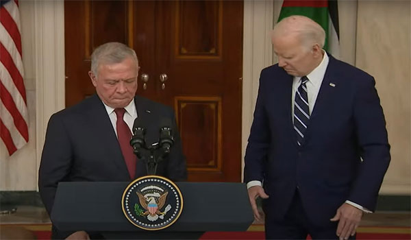 في تصرفات غريبة لكنها ليس بالجديدة، بدا الرئيس الأمريكي جو بايدن مشوشاً وهو يتجول خلف المنصة، يحدق في الأرض بينما كان ملك الأردن عبدالله الثاني يتحدث خلال لقائهما أمس في البيت الأبيض، وسط حديث عن صحة الرئيس العقلية.