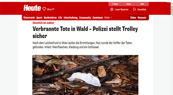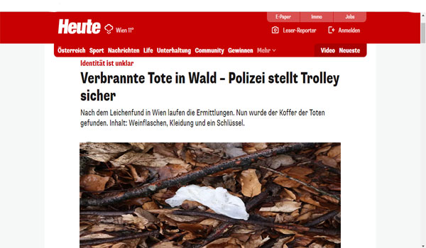 عثر أحد سكان مدينة فيينا على جثة امرأة متفحمة، مساء يوم الأحد، أثناء تنزهه في منطقة نائية بحي هيرنالز في فيينا.