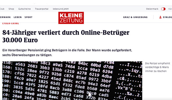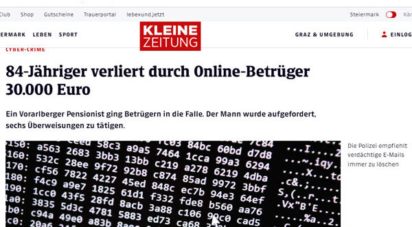 تعرض رجل مسن يبلغ من العمر 84 عامًا من مقاطعة فورارلبرغ لعملية احتيال خبيثة عبر الإنترنت، حيث خسر ما يقرب من 30 ألف يورو.