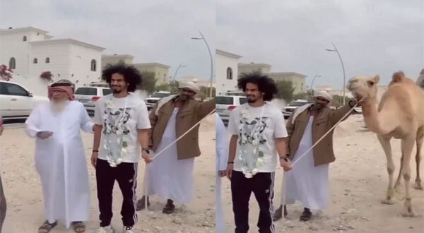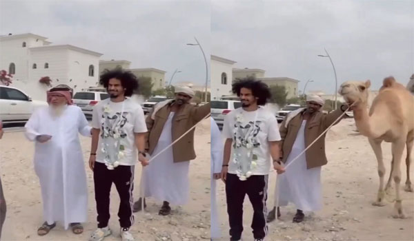 وأظهر مقطع فيديو متداول أكرم عفيف وهو يمسك بيده حبل الناقة، وبدا المسن القطري الذي أهداها له إلى جانبه.