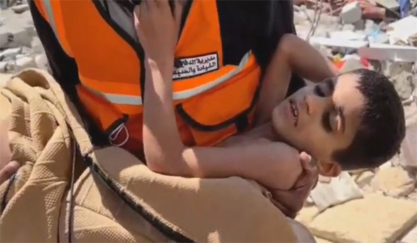 وظهر في المقطع أعضاء فريق الإنقاذ، يستخدمون حبلًا لسحب الطفل (نحو 10 أعوام) من تحت الأنقاض. وبعناية فائقة ويقظة شديدة، كانت الطواقم تسحب الطفل يدويًا، متخوفين من تعرضه لأي إصابات إضافية.
