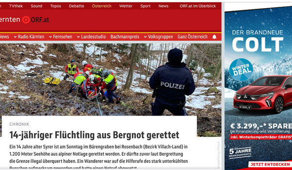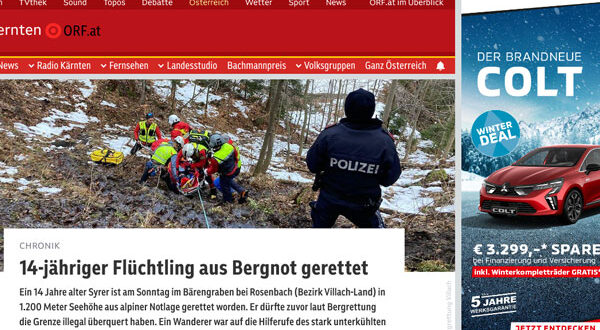 تم العثور على شاب سوري، يبلغ من العمر 14 عامًا، في حالة يرثى لها، يوم الأحد، في منطقة روزنباخ بولاية كارينثيا، وذلك بعد محاولته عبور الحدود النمساوية بشكل غير قانوني.