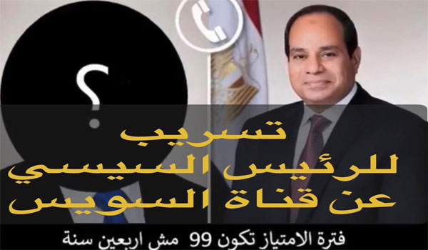 أثار تسريب متداول في منصات التواصل من مكالمة هاتفية منسوبة للرئيس المصري عبدالفتاح السيسي ضجة واسعة، بعد ما جاء فيها من حديث عن صفقة قيمتها تريليون دولار مقابل بيع قناة السويس لدول أجنبية لمدة 99 عاماً.