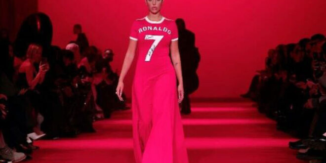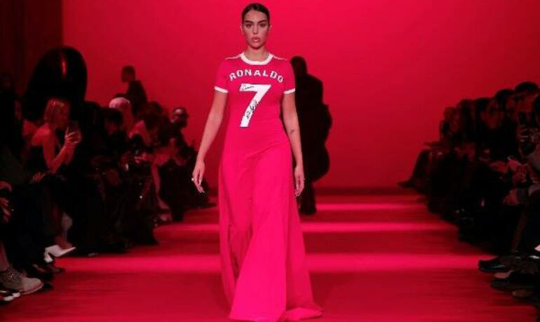 وظهرت جورجينا في مقطع فيديو مؤخرًا وهي تمشي على المنصة في عرض أزياء خلال مشاركتها في أسبوع الموضة بباريس، حيث ارتدت فستانًا رياضيًّا باللون الأحمر، محملًا بتوقيع رونالدو.