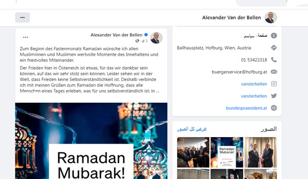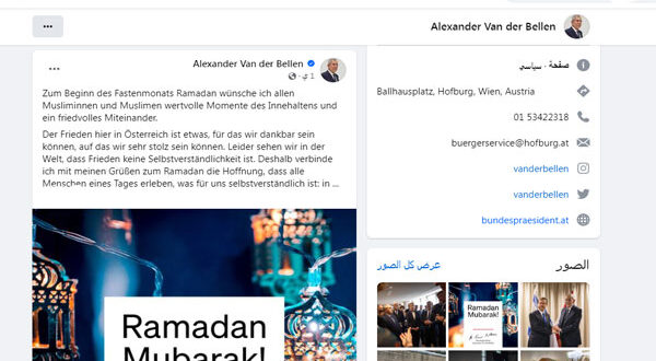 وقال الرئيس النمساوي في تصريح اليوم الإثنين، “في بداية شهر رمضان أتمنى لجميع المسلمين كل الخير والسلام”، مضيفا أن السلام المجتمعي في النمسا هو ركن أصيل وشيء يمكن أن نفخر به للغاية ولسوء الحظ يغيب السلام عن العالم في الظروف الراهنة.