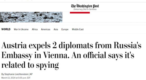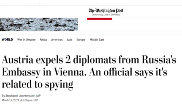 في خطوة تصعيدية، اتخذت النمسا، اليوم الأربعاء، قرارًا بطرد دبلوماسيين روسيين اثنين من أراضيها، وذلك على خلفية اتهامات موجهة لهما بممارسة أنشطة تجسسية تنافي الأعراف الدبلوماسية.
