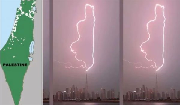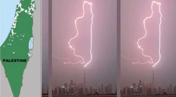بالفيديو – شاهد البرق يرسم خريطة فلسطين فوق برج خليفة.. ونشطاء: هل هو إنذار إلهي؟