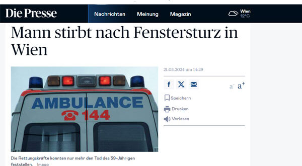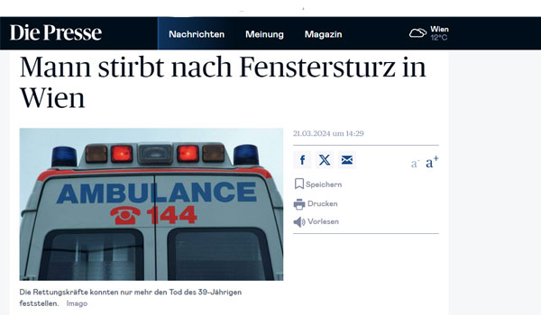 لقي رجل يبلغ من العمر 39 عامًا مصرعه، صباح يوم الأربعاء، إثر سقوطه من شرفة منزله في ظروف غامضة، في حي رودولفسهايم بولاية فيينا العاصمة.