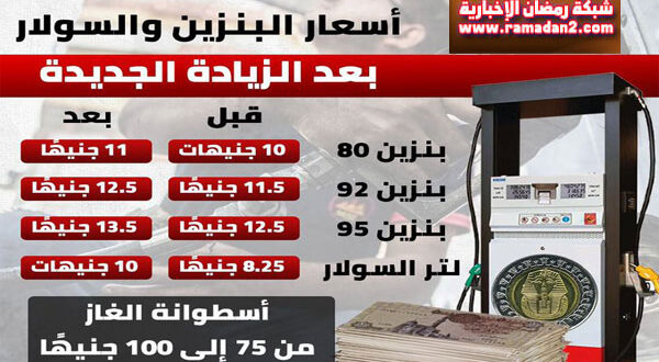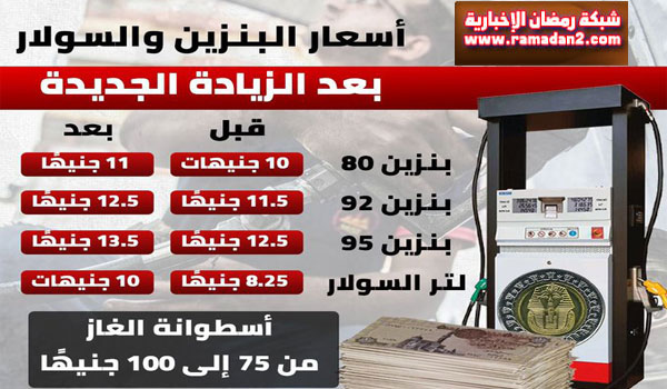ـ سعر البنزين 92 ارتفع إلى 12:50 جنيه بدلا من 11:50 جنيه.