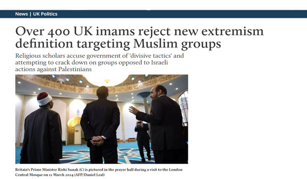 وقَّع أكثر من 400 إمام وعالم دين بريطاني على خطاب يرفض تعريف الحكومة البريطانية الجديد للتطرف، والذي يستهدف عدداً من المنظمات الإسلامية البريطانية، بحسب موقع Middle East Eye البريطاني، الجمعة 22 مارس/آذار 2024.