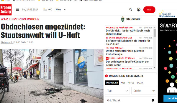 ألقت الشرطة القبض على رجل، يبلغ من العمر 65 عامًا، من الاتحاد الروسي، للاشتباه في إضرامه النار في رجل بلا مأوى، يبلغ من العمر 52 عامًا، ليلة الجمعة، في مدينة غراتس بولاية شتايرمارك.