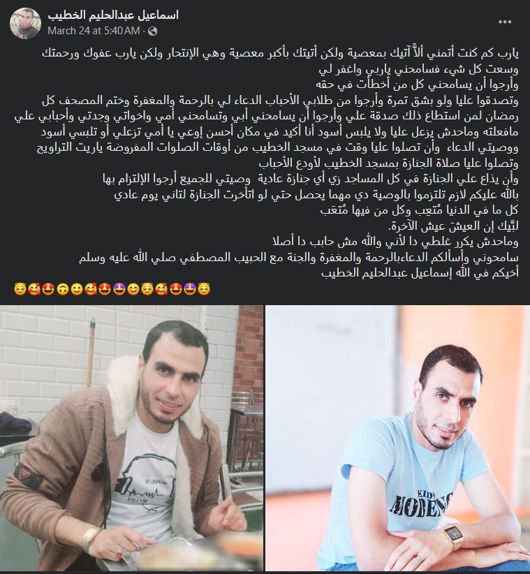 وشيّع أهالي قرية الرشايدة بمحافظة سوهاج المصرية، عصر الاثنين، جثمان الشاب محفظ القرآن “إسماعيل عبد الحليم الخطيب”، الذي ترك رسالة طويلة ومؤثرة نشرها عبر حسابه بفيسبوك قبل أن ينهي حياته بدقائق قليلة.